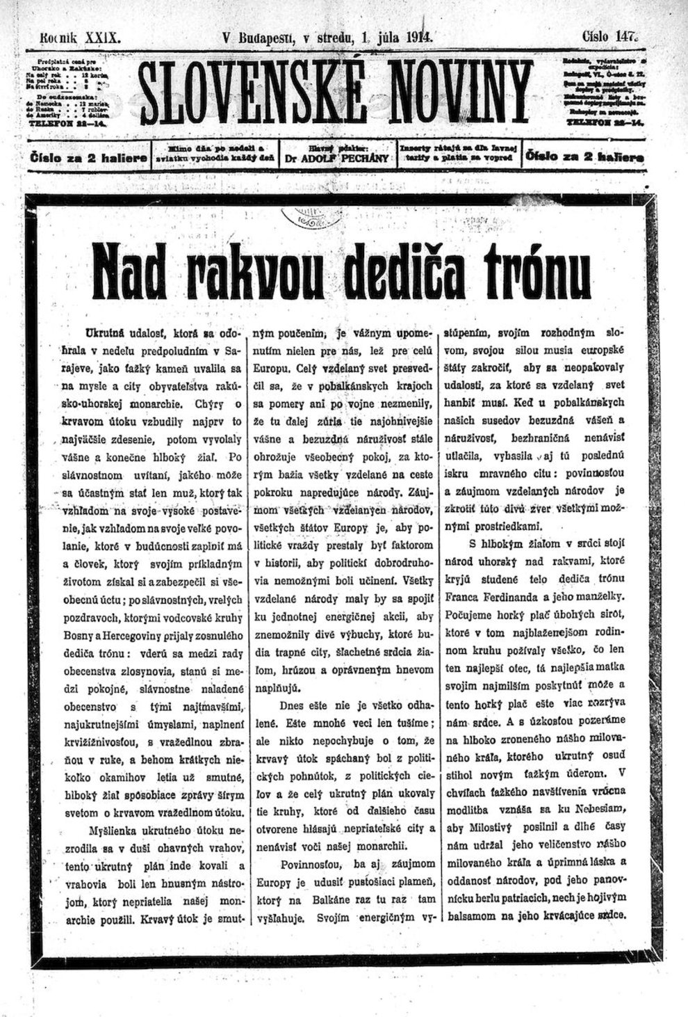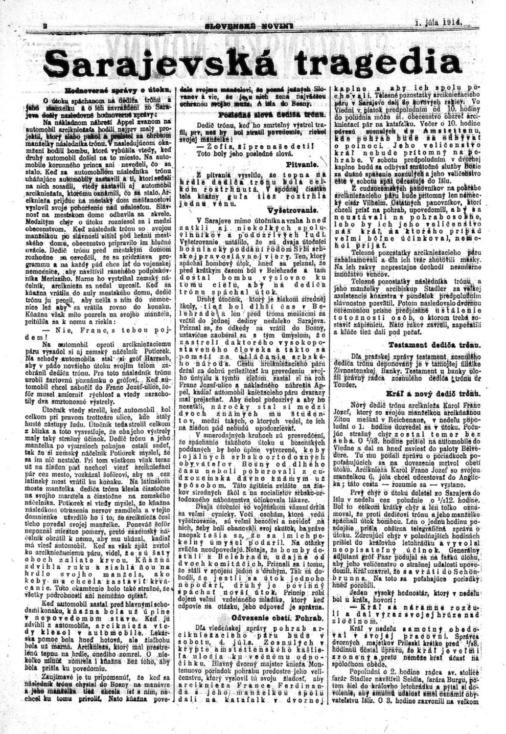 Ukrutná udalosť, ktorá sa odohrala v nedeľu predpoludním v Sarajeve, jako ťažký kameň uvalila sa na mysle a city obyvateľstva rakúsko-uhorskej monarchie. Chýry o krvavom útoku vzbudily najprv to najväčšie zdesenie, potom vyvolaly vášne a konečne hlboký žiaľ. Po slávnostnom uvítaní, jakého môže sa účastným stať len muž, ktorý tak vzhľadom na svoje vysoké postavenie, jak vzhľadom na svoje veľké povolanie, ktoré v budúcnosti zaplniť má a človek, ktorý svojím príkladným životom získal si a zabezpečil si všeobecnú úctu; po slávnostných, vrelých pozdravoch, ktorými vodcovské kruhy Bosny a Hercegoviny prijaly zosnulého dediča trónu: vderú sa medzi rady obecenstva zlosynovia, stanú si medzi pokojné, slávnostne naladené obecenstvo s tými najtmavšími, najukrutnejšími úmyslami, naplnení krvižížhivoťou, s vražedlnou zbraňou v ruke, a behom krátkych niekoľko okamihov letia už smutné, hlboký žiaľ spôsobiace zprávy šírym svetom o krvavom vražedlnom útoku.